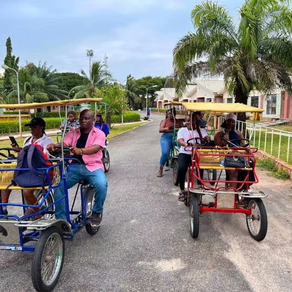 It has a large family swimming pool, a Coco Bar by the poolside, live music and entertainment, a playground for children, and an on-site restaurant serving Nigerian and international cuisine. All food is cooked to order. The resort has a festive and social vibe.
