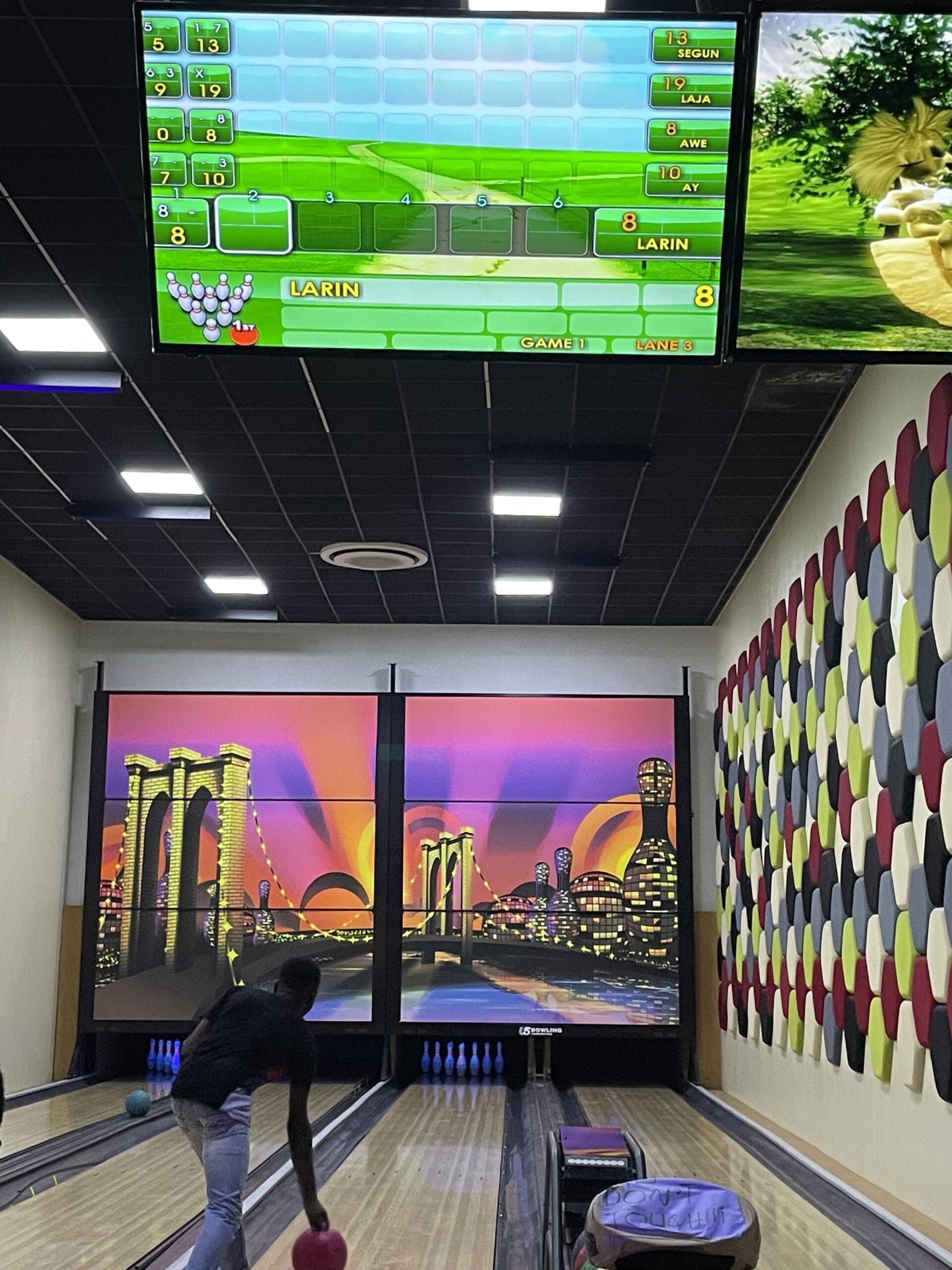 • Modern bowling alley with multiple lanes.